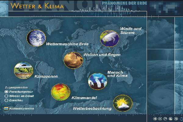 Wettermaschine Erde Wolken und Regen Winde und Stürme Klimazonen Mensch und Klima Klimawandel Wetterbeobachtung Klimadiagramme |